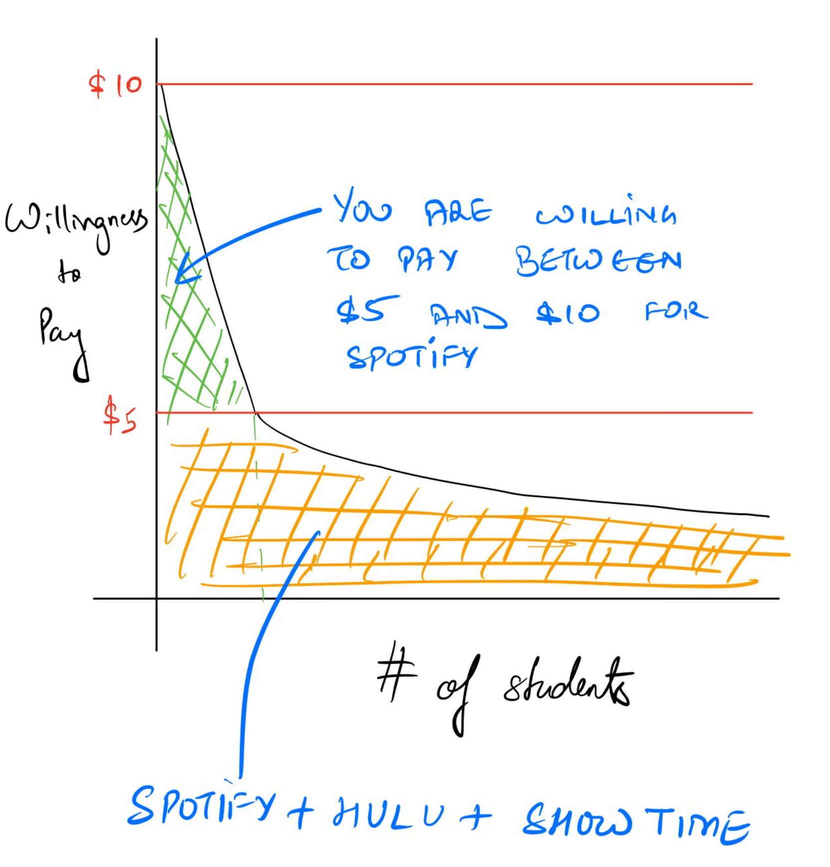 Perhaps I subscribed to the Spotify bundle because somewhere, I felt that the whole gave me much more value than Spotify by itself. Other students might go for the Spotify bundle for different reasons; for example, if they badly want Spotify such that their willingness to pay for Spotify alone is more than their willingness to pay for these services, individually. In other words, if you fall in the green zone for Spotify, the bundle is probably a good idea for you.