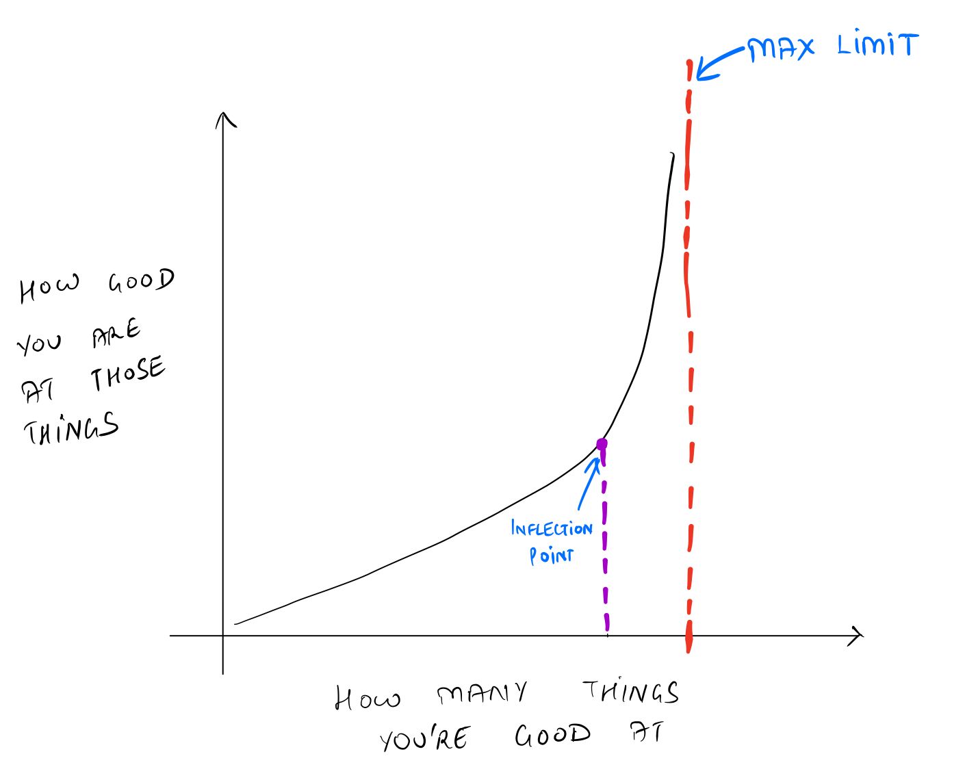 - See this graph. It’s better to start off with doing many things, build different mental models, and gather knowledge from different domains. Then, at some point, you should trade off doing many things for getting better at few. (Yes, this is obvious, but the graph puts it clearly.)