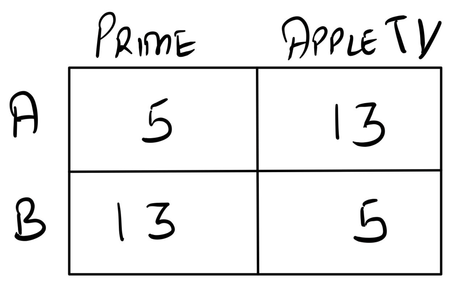 A is willing to pay $13 for Apple TV and B is willing to pay $13 for Prime Video. Assuming you don't know both A's and B's willingness to pay, you charge $12 to A for Apple TV and $12 to B for Prime. Your total revenue is $24.