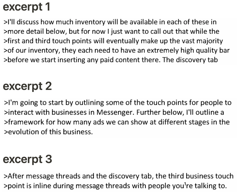 This is pretty self-explanatory, but really, here, Mark is outlining the broad vision for Messenger with a clear business case for highly-specific examples and use-cases. In that regard, I'd say this memo is broad enough that it communicates the vision and specific enough that it communicates how exactly we can realize that vision. Having a note written from these two contexts is what makes this super-interesting and useful. It's more like a cross between Ben Thompson's writing, with Matt Ball's thoughts, with Venkatesh Rao's reasoning, except it's all in a prose and number-less paragraph format. I find one reason why 'strategy' is often laughed at or is accused of being 'fluff' is that it's often too abstract / meta. But if the strategist can be specific enough to pin-pointedly articulate what exactly they have in mind... That'll go a super long way.